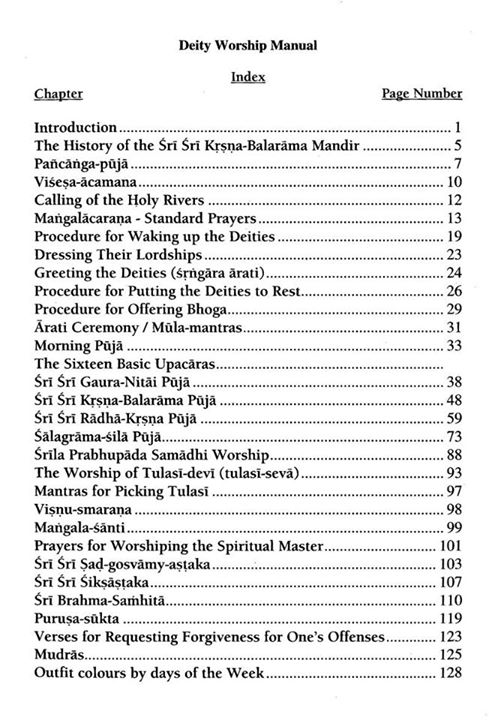 Ese manual, titulado en inglés Deity Worship Manual —Sri Sri Krishna-Balarama Mandir, que tiene en la portada una foto de Srila Prabhupada haciendo el aroti inaugural de las Deidades de Krishna-Balarama en 1975, tiene una extensión de 127 páginas y un nutrido índice, incluyendo la historia del Sri Sri Krishna-Balarama Mandir (establecido personalmente por Srila Prabhupada), citas de Prabhupada, el panchanga-puja, los procedimientos de adoración con mula-mantras, los 16 upacaras (parafernalia) básicos, las diferentes pujas y horarios, el procedimiento de ofrecer bhoga, despertar recibir y poner a descansar a las Deidades, la adoración del Srila Prabhupada Samadhi Mandir, la adoración de Tulasi-devi, la salagrama-sila puja, las ceremonias de aroti, diversas oraciones, ilustraciones de mudras usados en la adoración, y colores usados en los vestidos de las Deidades los días de la semana.